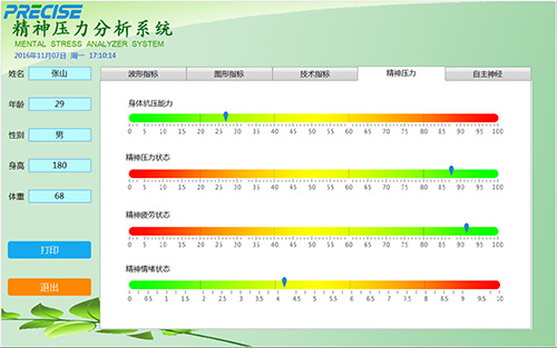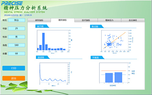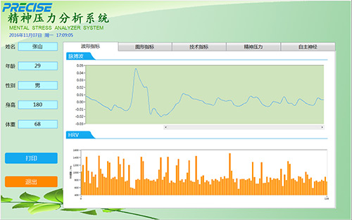 PRS-精神压力分析仪是一款客观测量精神压力水平的分析系统。应用心率变异性和加速度脉搏理论进行信号分析,检测自主神经系统平衡程度并自动量化分析,来客观反映人体精神压力状态。通过对HRV等系列指标的检测、分析,评估机体的调节能力,观察体内外应激物的抵抗及适应能力,心理障碍疾病发病风险,使患者积极配合治疗及提高治未病的意识,自主神经异常的早期发现、找治疗的效果。通过血管状态分析 (血管阶段、搏出强度、血管弹性,残血量,血管年龄),提示受检者注意。